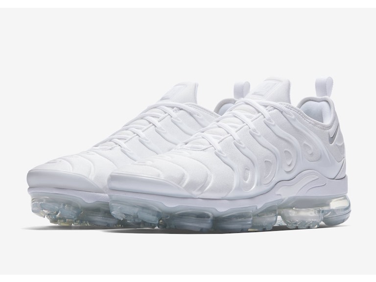 - The Nike Air VaporMax Plus White features an off-white neoprene upper with a white TPU cage and gray Swooshes.