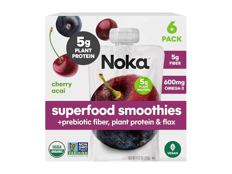 - (1) Noka Superfood Fruit Smoothie Pouches, Cherry Acai, Healthy Snacks with Flax Seed, Plant Protein and Prebiotic Fiber, Vegan and Gluten Free Snacks, Organic Squeeze Pouch, 4.22 oz, 6 Count