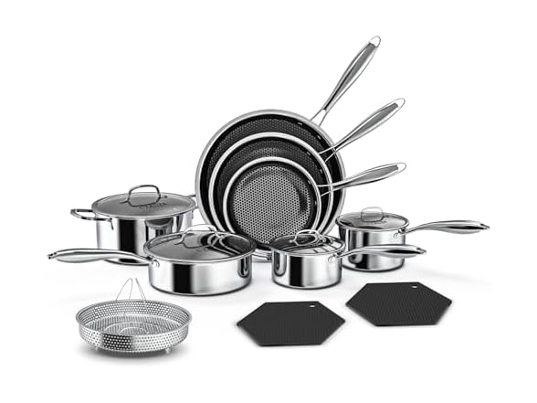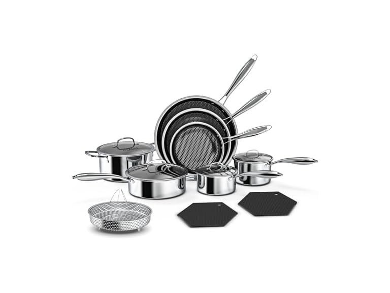 - [Healthy & Durable Material] - Your family's health is our priority. Crafted with food-grade 18/10 stainless steel, this cookware set is built to last and completely PFOA-Free. You can cook with confidence, knowing no harmful chemicals are used. The premium material offers superior resistance to rust, corrosion, and staining, guaranteeing long-lasting performance and a safe cooking environment for your loved ones.