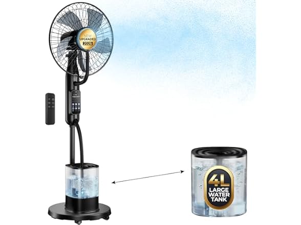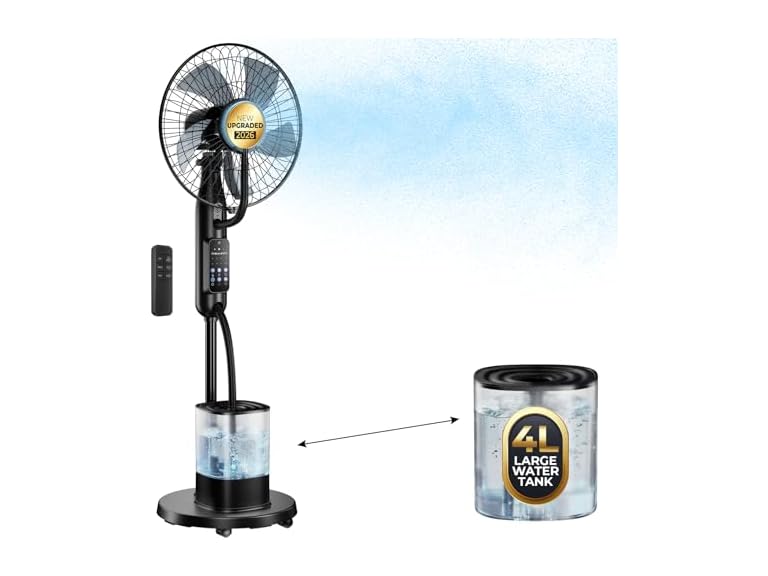 - (1) Misting Fan, 2026 Upgraded 4L Large Water Tank Mister Cooling Fan, 5 Speeds 3 Modes Misting Standing Fan, Floor Fan with Remote for Home, Bedroom, Patio, Outdoor Pcs
