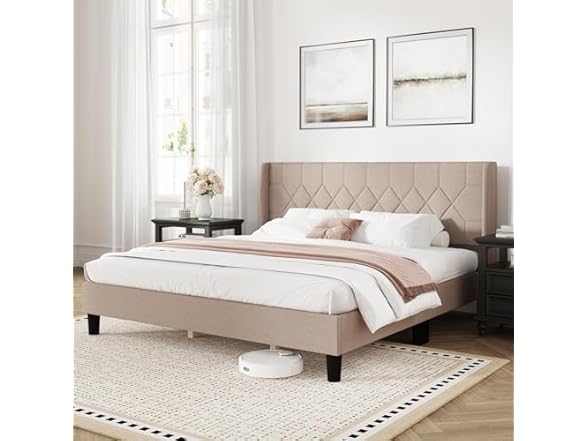 - (1) Novilla King Bed Frame, King Bed Frame with Headboard, Linen Upholstered Pull-Point Wing Side Headboard, No Box Spring Needed, Heavy Duty Feet, Easy Assembly, Beige