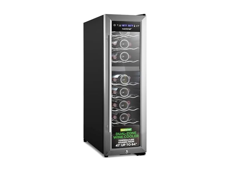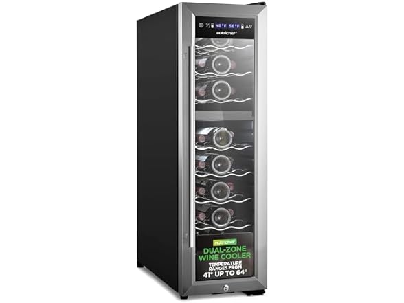 - Nutrichef 24 Bottle Wine Fridge | Dual Zone Wine Chiller | Adjustable Temperature 41°F to 64°F | Ultra Quiet Operation | Wine Cooler For Home, & Office | Free Standing 39x11x23 IN (Black)