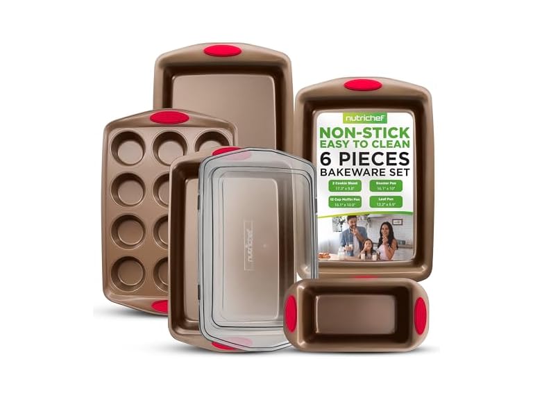 - NutriChef 6-Piece Bakeware Set - Carbon Steel Stackable Bakeware with Red Silicone Handles & Nonstick Coating, Includes Cookie Sheets, Roaster Pan with Lid, Loaf, and 12 Cup Muffin Pan (Gold)