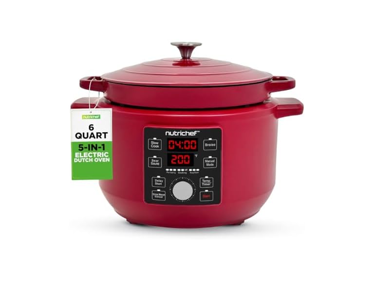 - Nutrichef 6 Quart Electric Dutch Oven | 1500W 5-in-1 Enamel Coated Cast Iron Pot with Stainless Steel Lid | Precise Temperature Control | Includes 2 Silicone Pot Holders & Heat Resistant Pad | Red