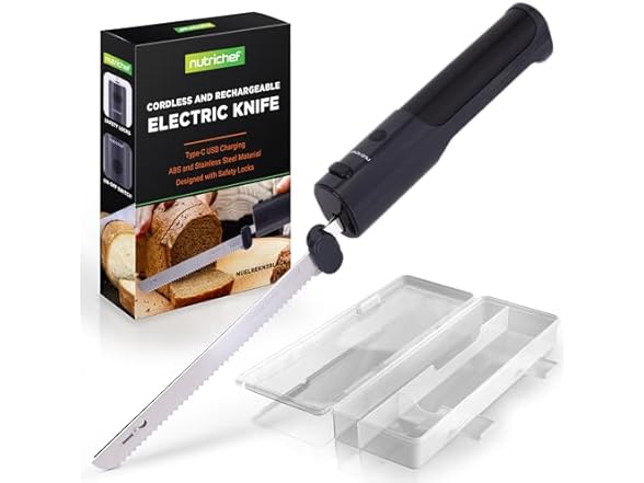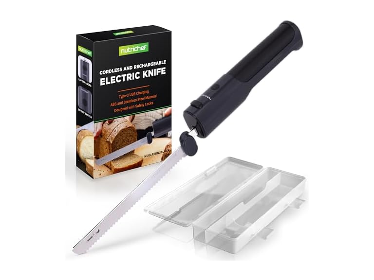 - NutriChef Cordless Electric Knife | Easy to Use Constant ON/OFF Safety Function | Lightweight Kitchen Knife | Carve Turkey, Meats, Poultry, Bread & Cheese | 11.42’’ Stainless Steel Blades | Black