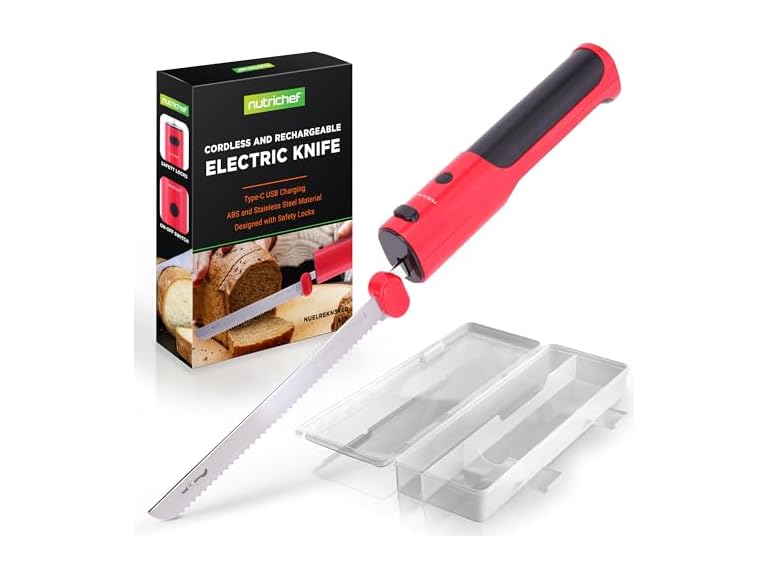 - (1) NutriChef Cordless Electric Knife | Easy to Use Constant ON/OFF Safety Function | Lightweight Kitchen Knife | Carve Turkey, Meats, Poultry, Bread & Cheese | 11.42’’ Stainless Steel Blades | Red