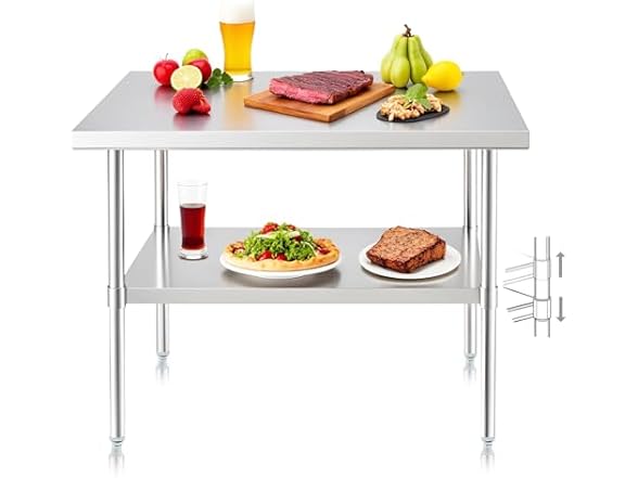 - HEAVY-DUTY STAINLESS STEEL: Top-tier 430 stainless steel work table delivers excellent corrosion resistance, strength, and long-term durability. The reinforced structure ensures this metal table stays stable for daily kitchen prep and professional use.