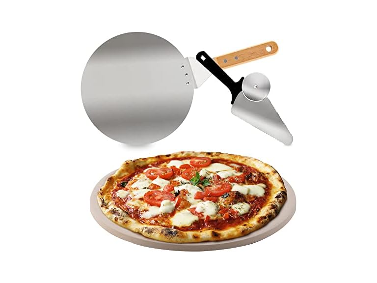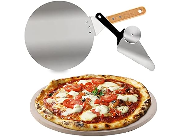 - (1) Nuwave Brick Oven-Style 3pc Pizza Kit,11.5” Cordierite Pizza Stone,10" SS Pizza Peel, SS Pizza Cutter/Server, For Indoor Electric Ovens, Outdoor Gas, Wood Fire Grills, BBQ Grilling, NuWave Bravo XL
