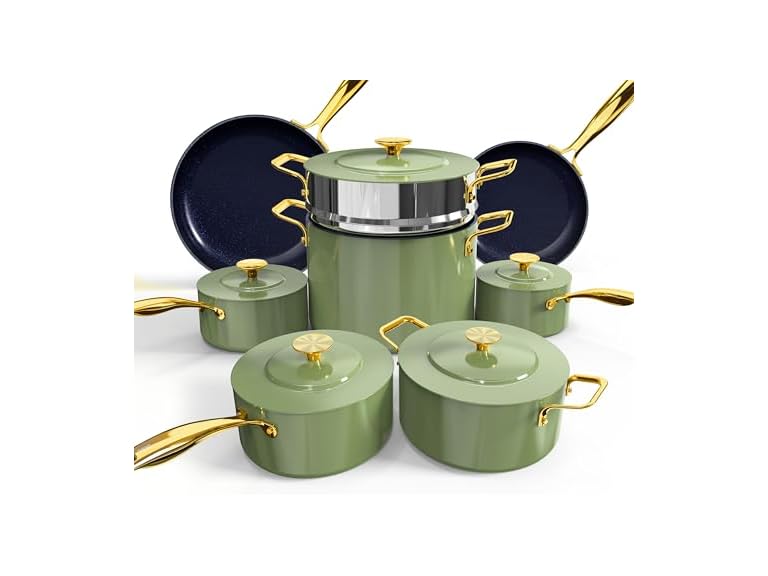 - Nuwave Lux LE 13-Pc Cookware Set with Elegant Gold Handle, Diamond Infused Ceramic Non-Stick, PFAS Free, Premium Metal Lids, Ergonomic Stay-Cool Handles, Induction Ready & Compatible w/All Cooktops