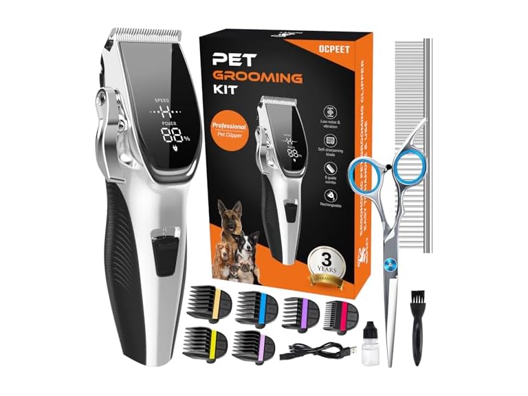 - User-Friendly & Ideal for New Pet Owners:OCPEET's dog grooming clippers are designed with comfort, ease of use, and convenience in mind. Featuring a one-touch operation, ergonomic anti-slip handle, and an anti-hair-jamming function, they're incredibly easy to hold and maneuver, reducing hand and wrist fatigue for all-day grooming comfort. The professional-grade clipper also boasts an HD LCD display, allowing you to effortlessly control the grooming process. Perfect for novice pet owners, OCPEET's dog grooming kit is your go-to solution for a flawless grooming experience