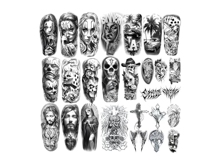 - Large Chicano Temporary Tattoo:It includes 27 large Chicano temporary tattoos in various sizes, featuring designs such as Our Lady of Guadalupe, Aztec symbols, crosses, Cry Later Lowrider, sugar skulls for the Day of the Dead, gambler motifs, religion, gangster themes, familia, prison inmate, rapper, dollar bills, chips, dice, faith, belief, joker, gothic clown, and goddess tattoo stickers. Suitable for men and women, these tattoo sleeves offer a wide range of styles.