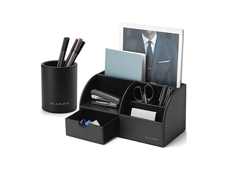 - Simple Compartment - Special big compartment for files, notebook and tablet device, small comparment and removable drawer are easy to keep pens, stapler, and paper clips; Designed by vlando to cover the small tool needed for office desktop storage.
