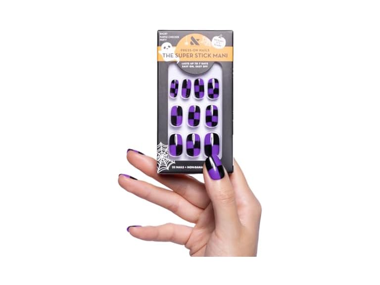 - Olive & June Super Stick Mani Press-On Nails | Short Squoval | No Glue Needed | 32 Tab Nails, 16 Sizes, Last Up To 7 Days| Non-Toxic, Easy On-Off Non-Damaging | Halloween Batty For You
