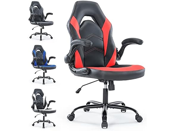 - (1) OLIXIS Gaming Chair Ergonomic Office Chair, Padded High Back Computer Desk Chair with Flip-up Armrests, PU Leather Executive Swivel Rolling Chair, Height Adjustable, Tilt & Lock, Red+Black (657)