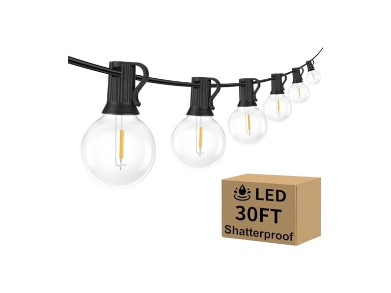- 【Waterproof & Shatterproof, Safe For Use】With fully sealed and waterproof design socket, The outdoor string lights can stay under the sun, rain, even in the worst weather conditions. Unlike other string lights that made by glass which easy to crack and heavy, the bulbs of our 30ft G40 outdoor backyard lights are made by plastic. It won’t be easily broken while dropping down or blow away by the wind, much safer for using, keep you away from dangerous shards