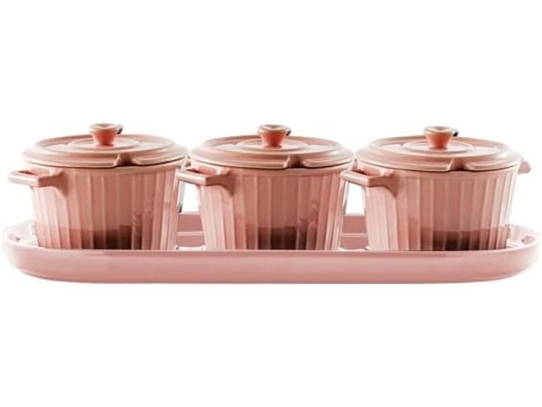 - (1) OVENTE Porcelain Condiment Jar Spice Container Set with Lid, Spoon and Tray, Pack of 3 Ceramic Condiment Pots, Sugar Bowl, Seasoning Box for Your Home and Kitchen Counter, 295ML | 10Oz, Pink BW11031P