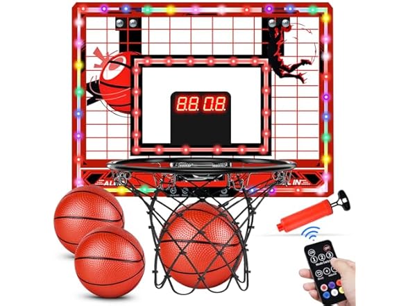 - Dual LED Lighting System & Electronic Scoreboard: The indoor basketball hoop for kids has a unique LED lighting effect, with a 7-color LED outer light strip and inner light strip with 6 adjustable color modes. Every successful shot is recorded in real-time, accompanied by an impressive light show and cheers, making each dunk more visually striking and igniting children's passion for basketball