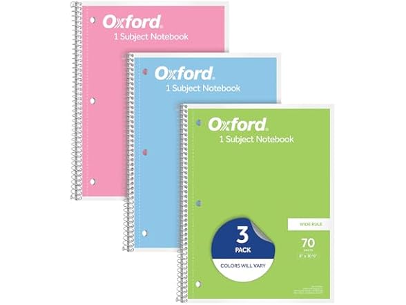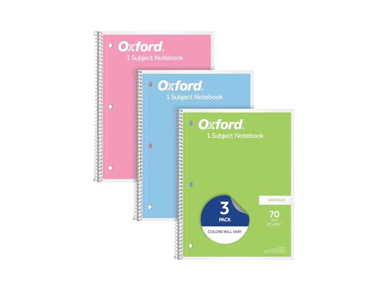 - (1) Oxford Spiral Notebooks, 3 Pack, 1 Subject, Wide Ruled Notebooks for School, 8 x 10.5 Inches, 70 Sheets, Assorted Pastel Colors, Back to School Supplies (1002541)