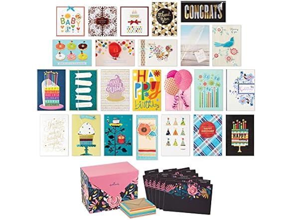 - Fun and festive boxed set contains everything you need to celebrate throughout the year: 24 greeting cards with coordinating envelopes, a storage box, and organizational dividers.