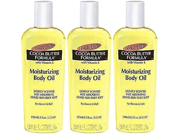 Experience deep hydration and luxurious softness with Palmer's Cocoa Butter Formula Moisturizing Body Oil. Infused with natural Cocoa Butter and Vitamin E, this vegan-friendly body oil delivers 48-hour moisture, leaving even the driest skin smooth, radiant, and healthy-looking. Its non-greasy formula absorbs instantly and is perfect for use in the shower, bath, or on dry skin. Free from parabens, phthalates, mineral oil, and dyes, it’s a gentle yet effective way to care for your skin. As America's #1 Cocoa Butter brand, Palmer's has been trusted for over 180 years to provide high-quality, natural products crafted with care in the USA.