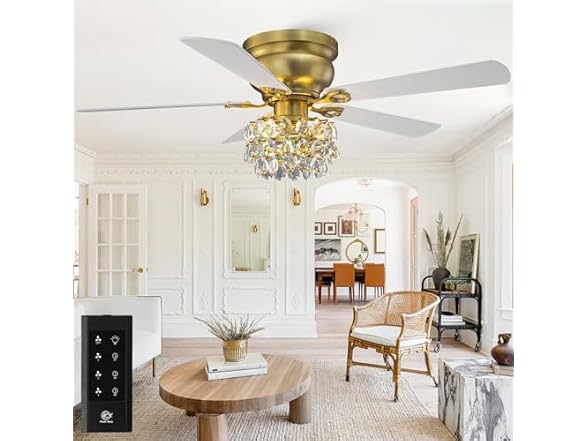 - (1) Flush Mount Ceiling Fan with Light and Remote, 48" Crystal Low Profile Ceiling Fan for Bedroom, Gold Brass Chandelier Ceiling Fans with 5 Plywood Blades, Reversible AC Motor for Living Room