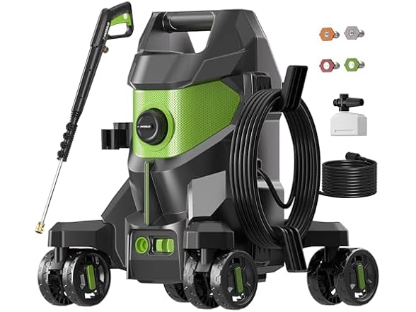- 【Versatile Spray Options 】Pressure Washer for Car Wash, includes 4 quick-connect metal nozzles (0°, 15°, 25°, 40°) and a foam cannon. Quickly switch between patterns for tasks from intense blasting to gentle rinsing, enhancing cleaning efficiency on all surfaces; the attached external foam cannon can produce dense foam in a short time, so that you can enjoy the pleasure of washing your car even at home!