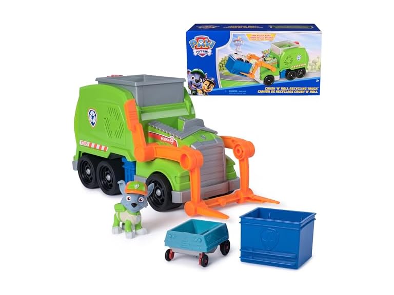 - (1) Paw Patrol: Crush N’ Roll Recycling Truck with Rocky Action Figure & Transforming Compacted Trash Vehicle, Kids Toys for Boys & Girls Ages 3 and up