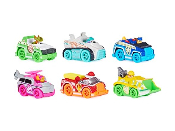 - 6 AUTHENTIC PAW PATROL TOY CARS: Each 1:55 scale vehicle is constructed using real metal and features authentic PAW Patrol details, with ultra-bright neon graphics and real working wheels