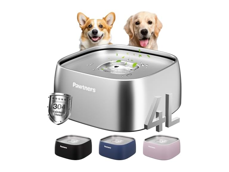 - (1) Pawtners Dog Water Bowl No Spill, 4L All Stainless Steel Slow Water Bowl for Dogs with Non-Slip Base, Spill Proof for Medium Large Messy Drinkers, Slow Drinking, Slobber Stopper, No Mess, Silver