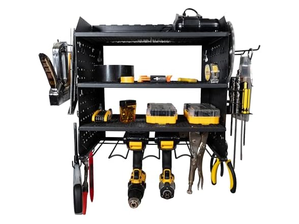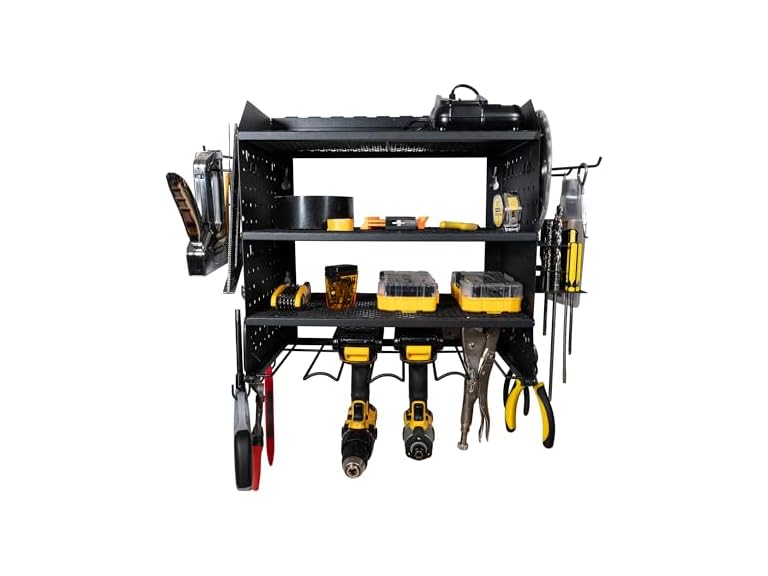 - ALL-IN-ONE STORAGE SOLUTION: Equipped with 4 drill holder slots, 3 steel shelves, 4 pegboard hooks, 8 universal hooks, and a side organizer to keep hand tools, drills, pliers, and screwdrivers neatly arranged and easily accessible