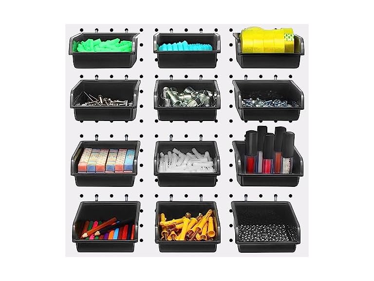 - (1) Pegboard Hooks Bins Assortment PegBoard Cups with Hooks Assortment Organization for Garage Craft Workshop Workbench Office (4.1"X3.9"X1.8")
