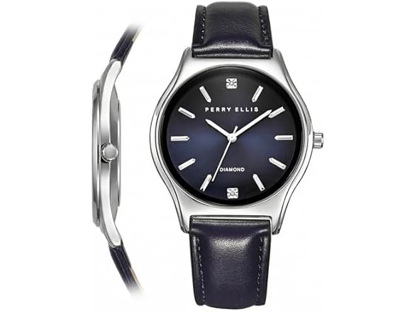 - Perry Ellis Ultra Slim Diamond Men’s Watch – Blue Sunray Dial, Silver Leather Strap, Water-Resistant Analog