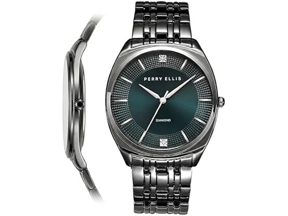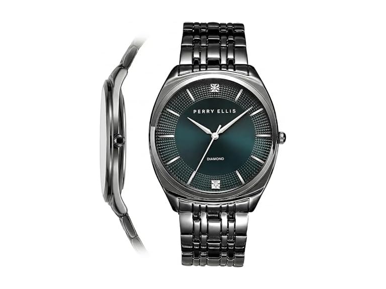 - Perry Ellis Ultra Slim Diamond Men’s Watch – Teal Sunray Dial, Gunmetal Alloy Band, Water-Resistant Analog