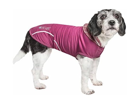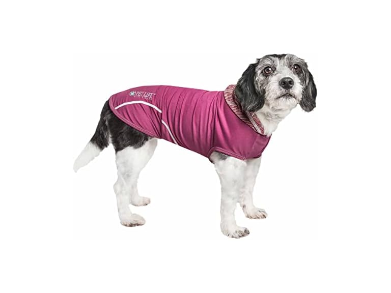 The Pet Life Active 'Pull-Rover' 4-Way Stretch Sleeveless Fitness Yoga Dog T-Shirt Hoodie features a Two-Tone and Heathered style Tank Top with a built-in Hood. This Hooded Tank Top provides a cutting-edge innovative and engineered Multi-blended Micro-fabric with high-stretching properties. When fused together this material offers higher levels of Permeability, Breathability and Stretchability. Features 4-Way Stretch Weaved Construction that moves better in every direction with a customizable tapered fit without the squeeze and won't bunch up. Material is extremely lightweight and Features Quick-Drying properties that both repels perspiration and dries really fast. Made of material that won't chafe or stick to skin or fur. This Hoodie also offers UV Protection against the suns harmful rays and fitted perfectly to help assist in containment or collection of shedded hairs. Features Dual Reinforced stitching at every seam for durability. Design features an accented super-thin second skin stretchy pull-over hood with accented buttoned trims and Reflective Taping for added night visibility. Machine Washable. This style is part of our Pet Life Activewear Collection. Available in Multiple Sizes and Colors. SIZING SPECIFICATIONS: In (Inches) "Back" Length is from Neck to Tail: * See image chart for sizing approximation EXTRA SMALL: Back: 9.8" Chest: 47.7" Neck: 13" SMALL: Back: 11.8" Chest: 17.7" Neck: 14.2" MEDIUM: Back: 15.8" Chest: 21.7" Neck: 16.2" LARGE: Back: 19.8" Chest: 26.7" Neck: 18.5" EXTRA LARGE: Back: 22.8" Chest: 31.7" Neck: 21.2"