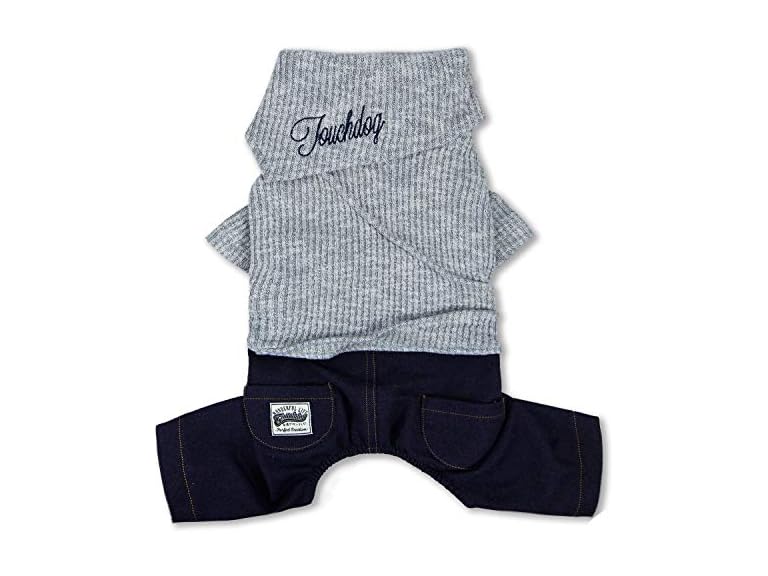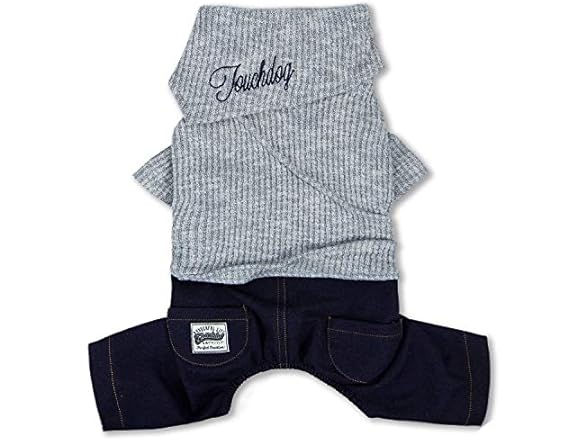 The Touchdog Vogue Neck-Wrap Sweater and Denim Pant Outfit is a 1 Piece outfit stitched together. This Full-body Dog Sweater is well crafted with a fashion-forward ribbed collar overlay that looks ultra-modern and trendy and comes together nicely with our Denim pant. The sweater is nice and breathable and features dual accented pockets along the backside and elastic conformed tubing throughout the length of the body that adds room for growth and provides a more tailored fit. Has a nice and comfortable stretch and feel throughout the outfit and completed with our embroidery along the back and pockets.