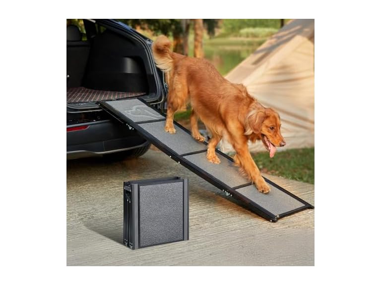 - Portable and Easy to Store - The PetThem Ramp for dogs to get in car folds up four times to a compact size of 17" x 4" x 17.2", making it easy to store in your car, under the bed, or beside the sofa without taking up much space. Weighing just 15 lbs and featuring a handle, it's easy to carry and adjust its position. Have your best friend join you on vacation with no trouble