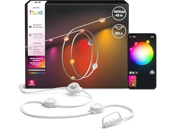 In the Box: (1) Philips Hue Festavia 150ft Permanent Outdoor String Lights, 80 Dimmable Lights, 55 Lumens Each, Weatherproof, Water-Resistant, White Wire, Color Ambience, Bridge Required