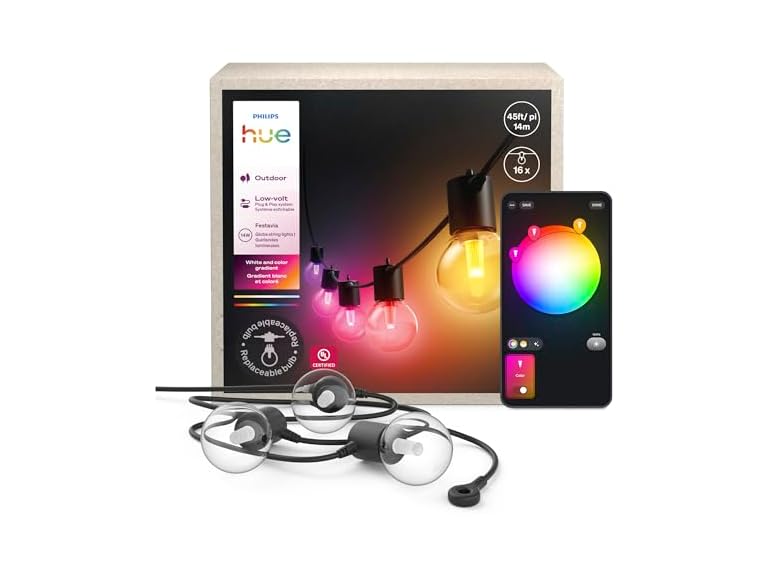 In the Box: (1) Philips Hue Festavia Globe Outdoor String Lights, White & Color Ambiance, 45ft,16 Bulbs, Dimmable, Control with Hue App or Voice, Bridge Required