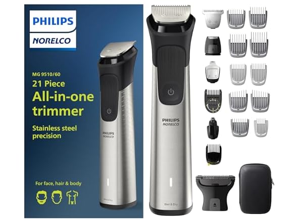 - The Philips Norelco Multigroom 9000 provides stainless steel precision with 21 tools and accessories in a premium storage case for a perfect beard, hair and body trim.