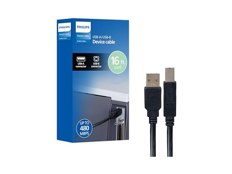 Philips USB-A to USB-B Printer Cable, 16 Ft Long Cord, Connect Laptop or Desktop, Data Transfer 480 Mbps, Gold Plated, HP, Canon, Brother, Samsung, Dell, Epson, Lexmark, Xerox, Black, SWV3173B/37