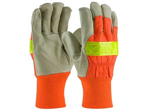 PIP Protective Industrial Products 125-448-M Pigskin Palm Gloves, Hi-Vis Back, Thinsulate Lining, Knit Wrist, Medium. The Pigskin Leather Palm Gloves feature high visibility nylon back with 3M Thinsulate liner and knit wrist. Top Grain Pigskin leather construction provides great breathability due its porous texture, becomes softer with use and withstands moisture without stiffening. Top Grain leather is smooth, provides durability and dexterity. 3M Thinsulate lining provides superior insulation without the bulk of fleece. 3M Scotchlite reflective band over knuckle provides workers with greater visibility in high risk and low-light applications. Gunn cut pattern delivers excellent durability, wear and comfort, especially for heavier gloves. Wing thumb increases comfort in open-handed work. Fabric back provides breathability and flexibility. Elastic closure sewn inside glove for safety and comfort. Leather finger tips for extra protection. Knit wrist helps prevent dirt and debris from entering the glove. Hi-Vis coloring makes this product very easy to see. Applications: farming, construction, machine operation, and refrigeration.