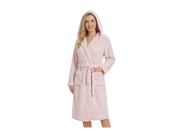 - Inspired by Y2K aesthetics, this women’s hooded bathrobe features a modern checkered pattern that adds visual depth and a fashionable edge to everyday loungewear. The cationic dyeing process ensures long-lasting color vibrancy and clear texture, helping the pattern remain sharp and stylish even after repeated washing and long-term daily use.