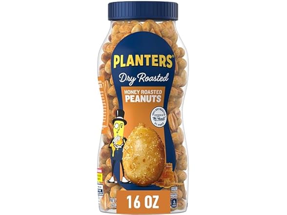 - (1) PLANTERS Honey Roasted Peanuts, Dry Roasted Peanuts, Party Snack, Plant-Based Protein, After School Snack, Sweet and Salty, Salted Nuts, Sea Salt & Honey, Snacks for Adults, Kosher, 16oz Jar