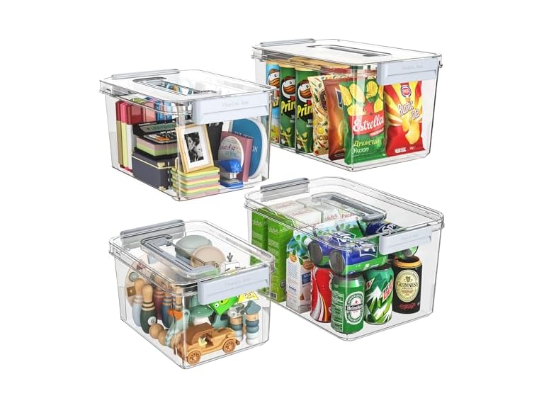 - Multi-Size storage bins: 2Pack (4.5 quarts) boxes and 2 Pack (8.5quarts) box , multi-size bins will statisfied with your different storage .Spacious storage bin exterior dimensions measuring (4.5quart)9"L x 7" W x 5.7"H ,(8.5quart)11.4"L x 8.3" W x 6.7"H.Perfect for organizing your pantry, closet, bedroom, garage, office, and more.