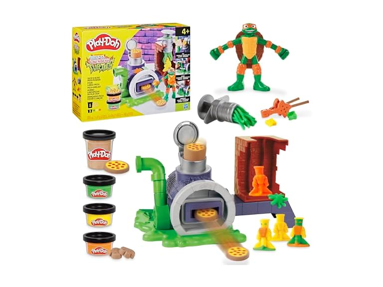 - (1) Play-Doh Teenage Mutant Ninja Turtles Slice & Blast Pizza Playset, Bendy 4 Inch Mikey Action Figure, Kids Arts & Crafts, TMNT Toys for Boys & Girls 4+