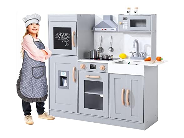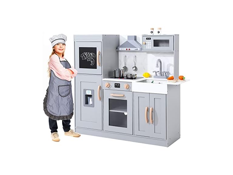 - Play Kitchen for Kids, Wooden Play Kitchen with Toy Storage System, Toy Kitchen Set with Plenty of Play Features, Gift for Ages 3+,Grey