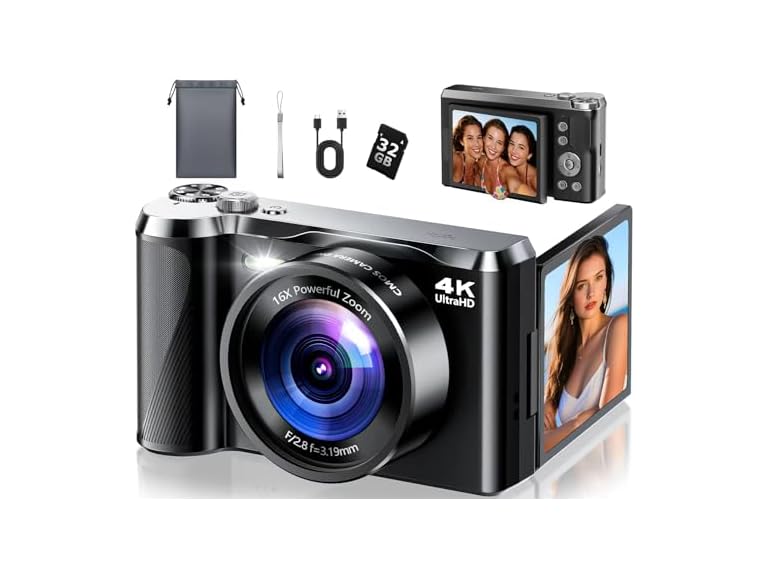 - 【16X Zoom & 3" Flip Screen】Master every shot with the 16X digital zoom and the versatile 3-inch flip screen. This point and shoot camera allows you to zoom in on distant subjects while using the large, clear screen to compose your shot with precision. The 3-inch flip screen makes selfies and vlog shooting more handy, ensuring you're always perfectly framed. It's the perfect travel camera for capturing landscapes and the ideal vlog camera for content creators.