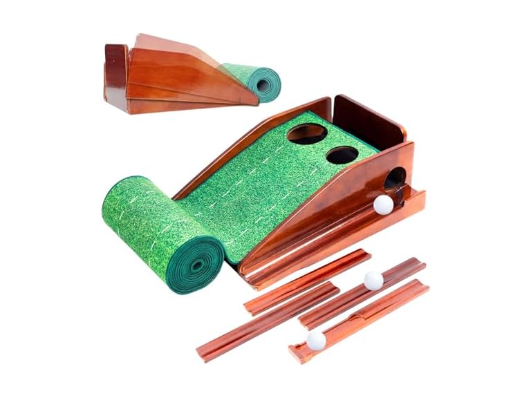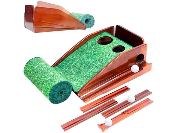 - Automatic Ball Return — Keep your Practice Smooth, Efficient and Focused. Crafted with a premium solid redwood support frame for stability. The 6.7 ft wooden return rail features a magnetic assembly design for quick and easy setup. After each putt, the ball returns automatically—no more bending down to pick it up.