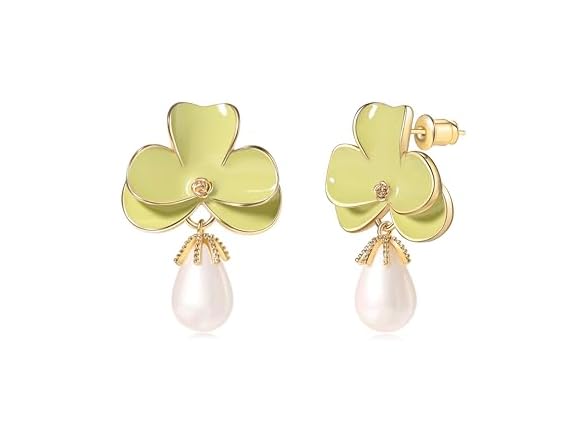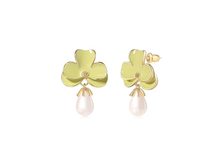 - (1) POSUR Flower Teardrop Pearl 14K Gold Plated Dangle Earrings for Women | Floral Enamel drop Ball Earrings | Lightweight Hypoallergenic (Light Green)