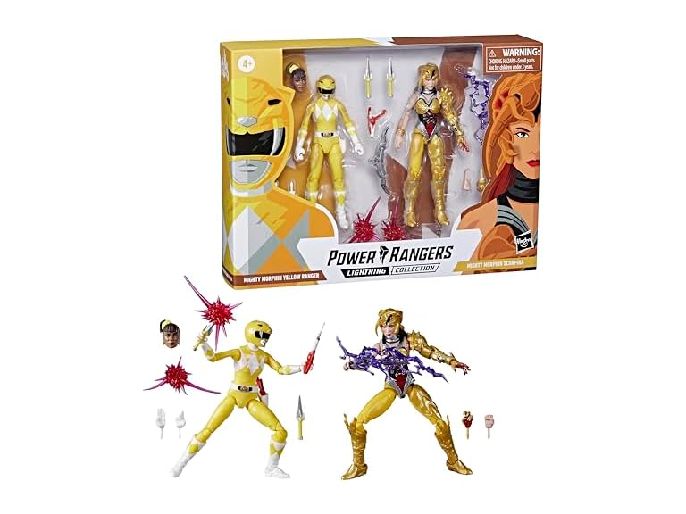 - INCLUDES CHARACTER-INSPIRED ACCESSORIES: This Mighty Morphin 2-Pack includes multiple character-inspired accessories, including Power Daggers, Scorpion Fin, blast effect pieces, and a swappable head for the Yellow Ranger, one of the Ranger in her helmet and one without